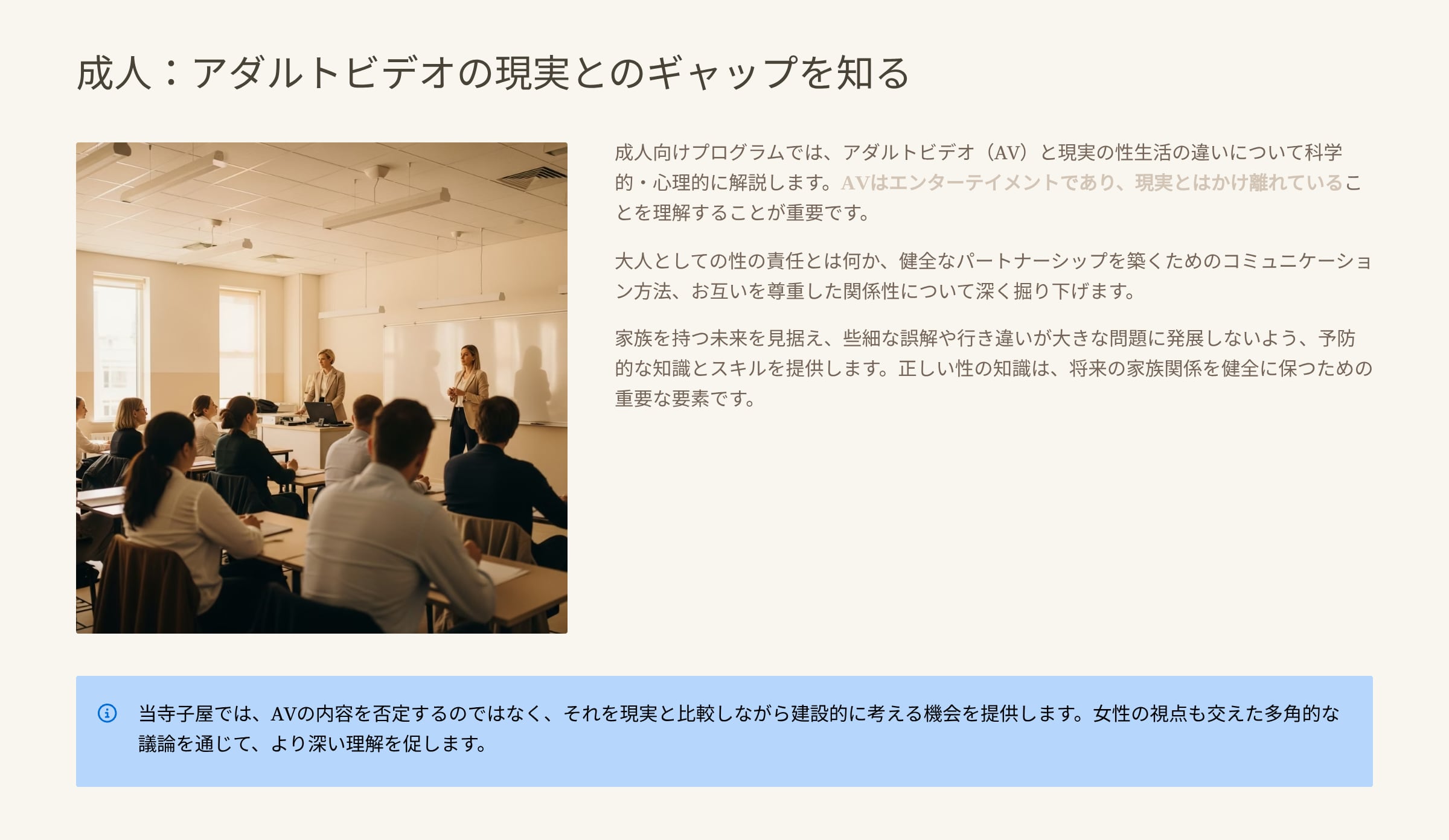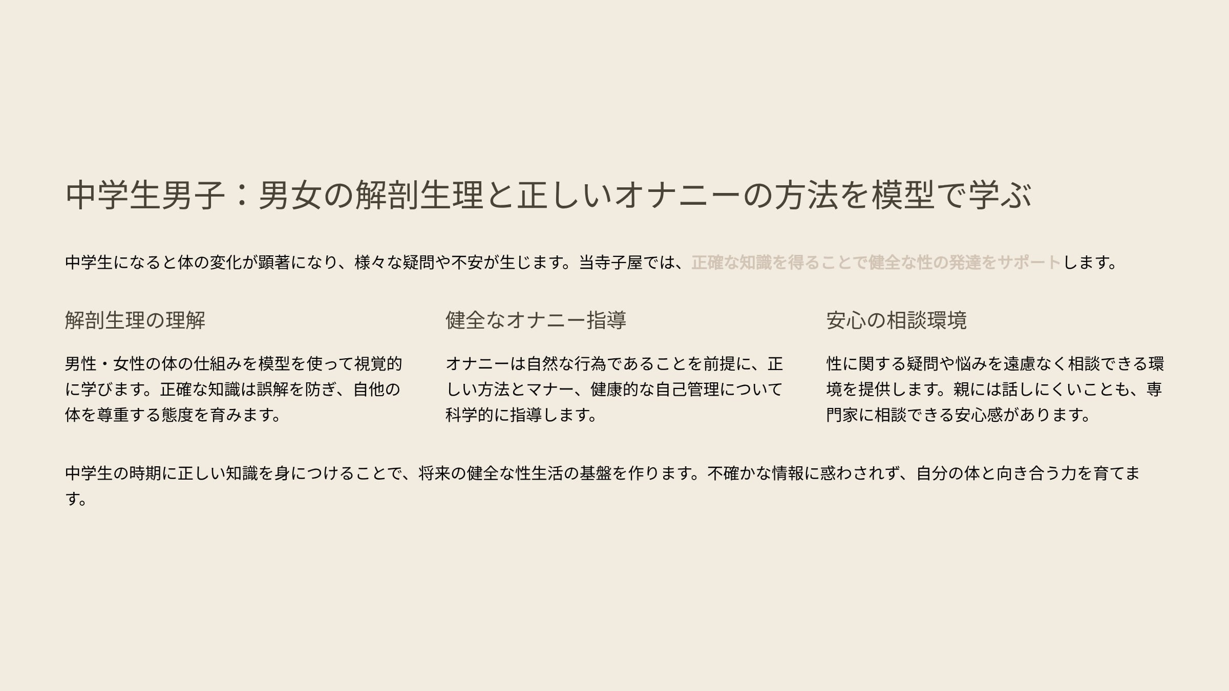 単なる生殖の仕組みだけでなく、感情、責任、倫理など多面的な性教育を提供します。自分の体を大切にし、他者も尊重できる男性を育てることが目標です。
